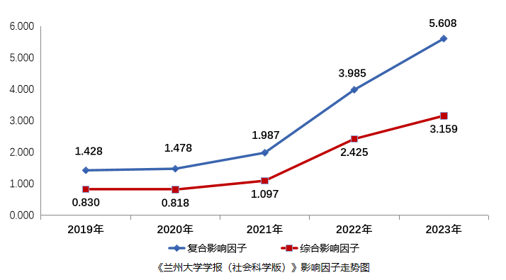 据近日发布的《中国学术期刊影响因子年报(人文社会科学?2024版)》显示,《兰州大学学报(社会科学版)》的学术影响力再次大幅上升。学报复合影响因子在604种综合性人文、社会科学期刊中排名11位,影响力指数CI值排名23位,较2023年分别上升14和11个位次。期刊复合影响因子和综合影响因子分别为5.608和3.159,较2023年增幅分别达到40.73%和30.27%,期刊影响力指数学科排名和影响因子大幅攀升,取得历史最好成绩。